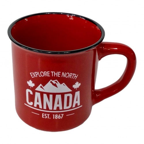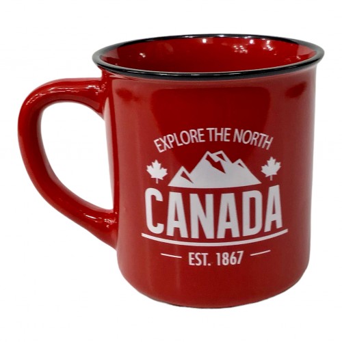 CANADA COFFEE MUG – EXPLORE THE NORTH WHITE PRINT W/ RED BACKGROUND TEA CUP 13 oz