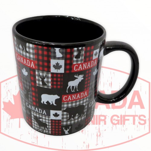 Canada Coffee Mug with Canadian Highlights – Moose, Bear, Deer and Maple Leaf – Plaid Themed Design