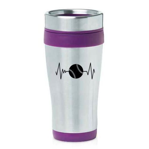16oz Insulated Stainless Steel Travel Mug Heart Beats Softball Baseball (Purple),MIP