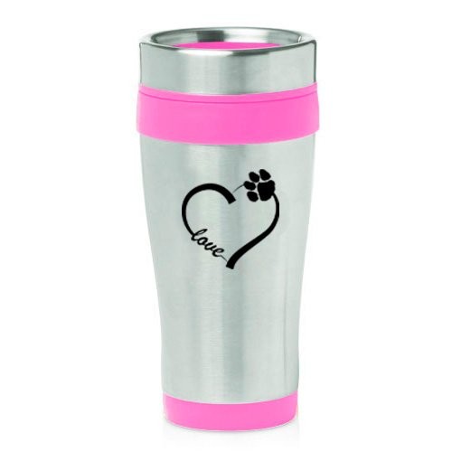 16oz Insulated Stainless Steel Travel Mug Love Heart Paw Animals (Pink),MIP