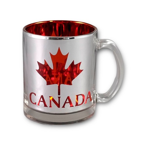 CANADA 11oz GLASS MUG – RED/SILVER W/ MAPLE LEAF FOR COLD AND HOT DRINKS MUG