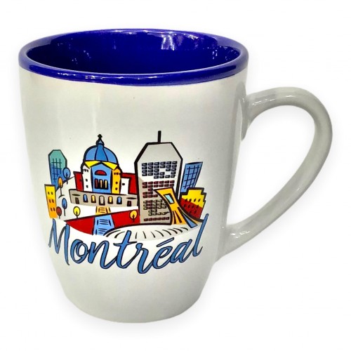 MUG MONTREAL SCENIC VINTAGE PRINT W/ HISTORY TEXT TEA CUP WHITE AND BLUE