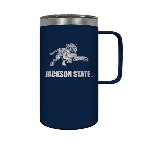 The Hustle is a 18oz vacuum insulated travel mug with large handle. Includes spill resistant lid and features laser etched team graphics.