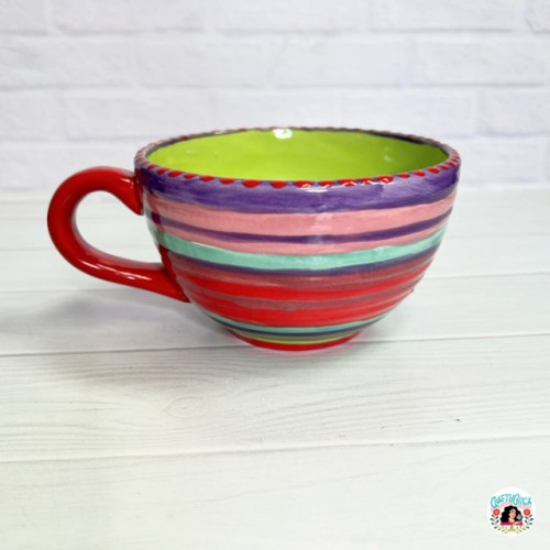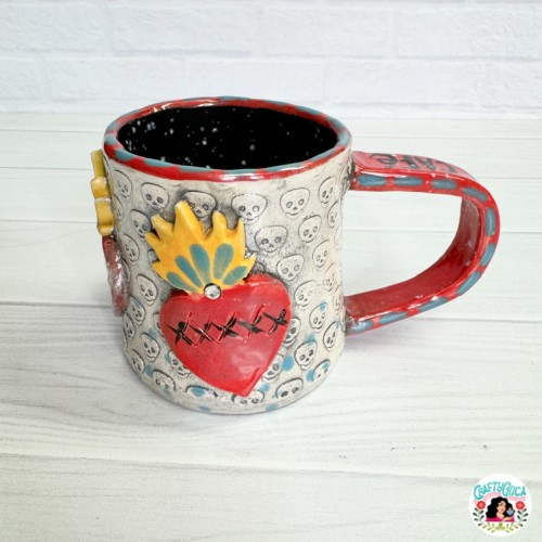 This is an amazing fired ceramic hand painted mug by Patrick Murillo. It is lined with a sergeant around the top, then has an Aztec warrior, corn, and a spaceship and a pyramid. It tells a beautiful story of cultura y historia.
