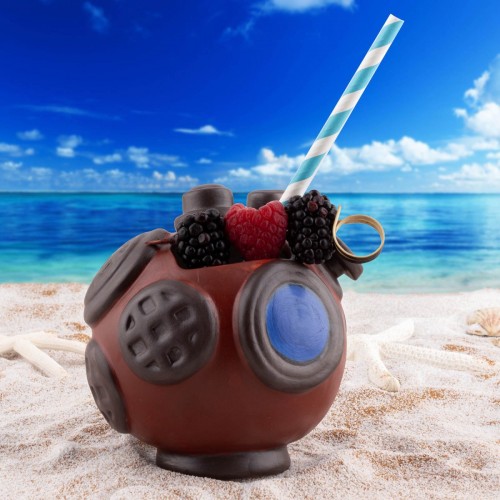 Our unique Diver’s Helmet Tiki Mug is a captivating addition to have in your tiki mug collection. Crafted from high-quality ceramic, this mug is designed to resemble a diver’s helmet, featuring intricate details and a striking red, brown, and blue color scheme. The matte finish adds a touch of sophistication to this eye-catching piece. With its generous capacity, it’s perfect for serving up your favorite tropical cocktails and beverages. Whether you’re a collector or simply love distinctive drinkware, this diver’s helmet tiki mug is sure to spark conversation and bring a nautical flair to your home bar or kitchen.