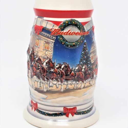 - Details: This mug has a very nice design with the famous Clydesdale horses, all dressed in their holiday bells , galloping past the Christmas Tree in front of the Capitol building. Don’t miss the great detail on the handle, it is shaped after one of the columns at the Capitol building. The bottom is stamped: “CS455 Holiday at the Capitol, 2001, Budweiser Holiday Stein, Handcrafted Expressly for Anheuser-Busch, Inc by Ceramarte of Brazil, 200, Anheuser-Bush, Inc St Louis, MO”. Excellent gift for beer aficionados, Budweiser collectors, as bar decor or for your favorite beer drinker.