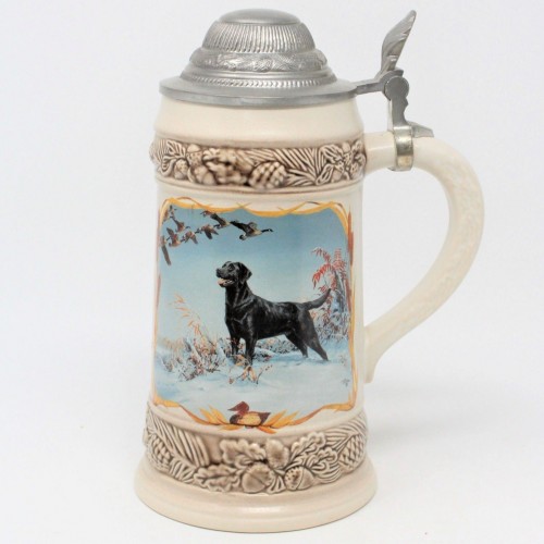 - Details: This is a gorgeous Beer Stein with Pewter lid. It is based on two of Linda Picken’s paintings, “Winter Music” is on one side shows a Black Lab in the snow with Canadian Geese flying overhead. The other side shows a “Black Lab” portrait, gorgeous dog laying in the dry cattails with mallards flying overhead. The dog scenes are bordered by an oak leaves and acorns design, pine needles and pine cones. The lid is made of pewter and has a wonderful acorn and pine cone design, the mechanism for lifting is an acorn leaf. The acorn leaf motif cascades down the handle. This mug is a great addition to an existing collection, or the perfect father’s day gift or a gift for a Labrador Retriever lover/owner. Great addition for a bar or man cave decor.