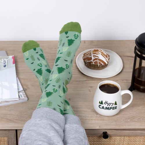 - IN-HOUSE DESIGN: The socks feature various green shrubs, pine trees, and maple tree patterns on a light green background. The heels, toes, and ankles are dark green. The mug has a sparkly green and black “Happy Camper” sentiment and several pine tree glossy decals on one side.