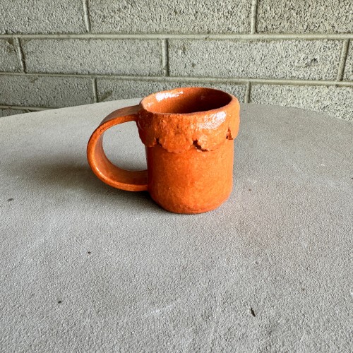 This is a fired ceramic hand painted mug that shows a house with different low rider and classic cars.