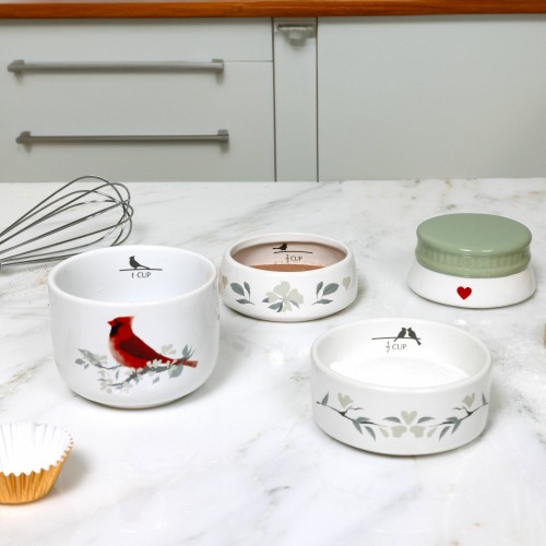 - PREMIUM QUALITY: Crafted from durable ceramic with a glossy glaze, this 6.75″ stackable measuring cup set combines functionality with heartfelt artistry. The set includes four measuring cups that neatly stack to form a jar-shaped display featuring a vibrant red cardinal perched on delicate watercolor branches. Each cup is printed with measurement markers inside and soft botanical artwork outside for a cohesive, elegant look. Packaged in a custom wrap and protective white die-cut box for secure gifting or storage.