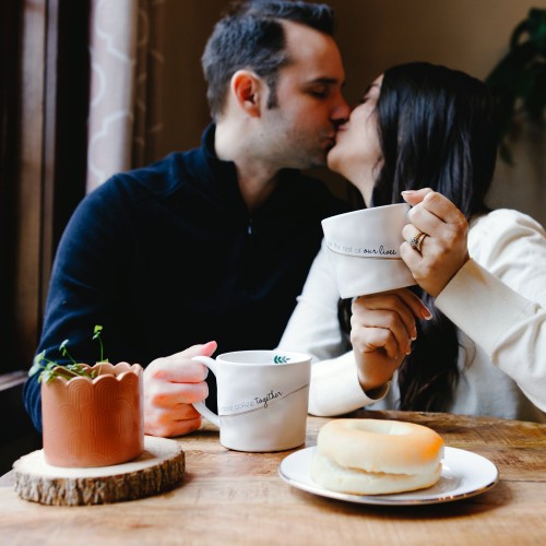 - IN-HOUSE DESIGN: Beautifully designed cups feature an iridescent white pearl sparkle glaze, a watercolor rowan leaf design, and a gold-striped wrap-around pattern. The sentiment “Let’s have coffee Together” / “for the rest of our lives” and the design are sharp, vivid, and applied on the front of the mug. Sentiments are non-fading and made to last with the mugs.