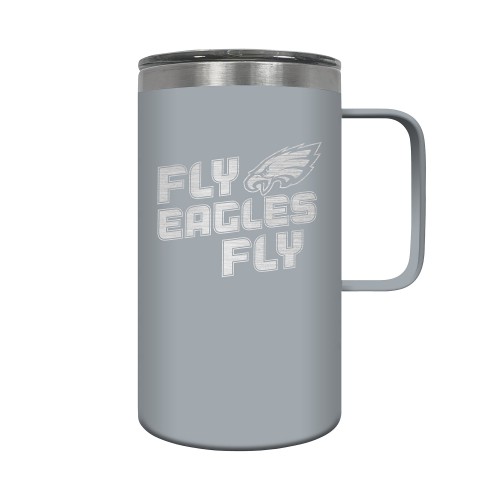 The Hustle is a 18oz vacuum insulated travel mug with large handle. Includes spill resistant lid and features laser etched team graphics.