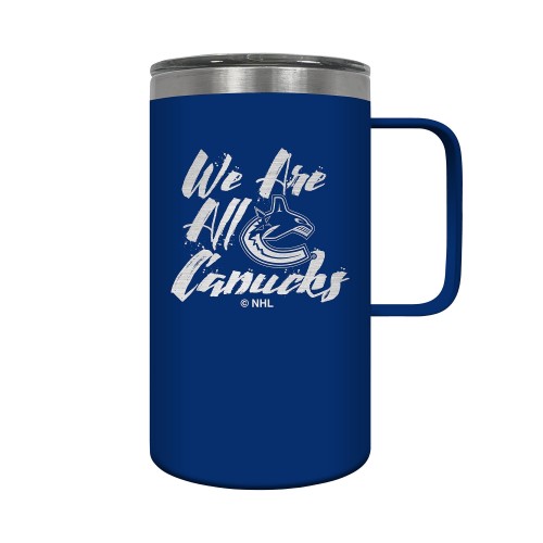 The Hustle is a 18oz vacuum insulated travel mug with large handle. Includes spill resistant lid and features laser etched team graphics.