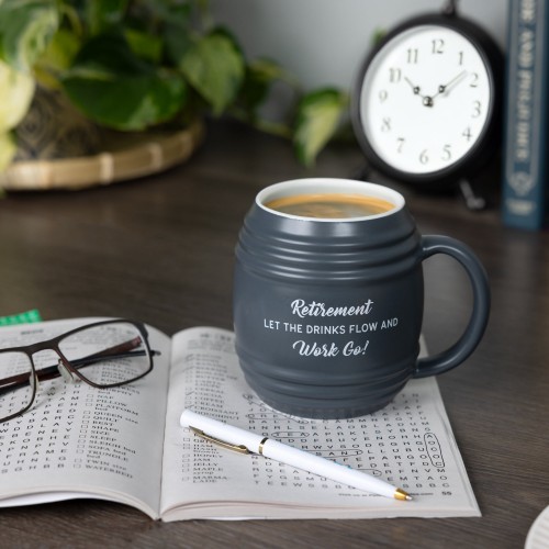 - IN-HOUSE DESIGN: The bold, raised lettering “Retirement – Let the Drinks Flow and Work Go!” brings humor and personality to the mug, celebrating the joys of retirement. The glossy white decals contrast beautifully against the deep blue matte finish, while the embossed text adds a layer of sophistication and tactile appeal. With sculpted barrel details, this in-house design captures the essence of a relaxing, well-deserved retirement in a stylish, functional format.