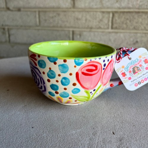 This mug is hand painted by me (Kathy, The Crafty Chica), and it is painted inside and out. It has a variety of colors. The base is a light cream shade and the inside is bright blue.