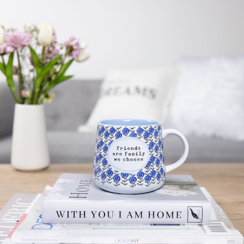 - IN-HOUSE DESIGN: You will see a typewriter with a “Friends Are Family We Choose” sentiment inside an oval shape with a triple-line blue design. A light blue glossy interior smooth-edged vessel with a glossy exterior with walls that feature a blue and black vine ranunculus design that wraps around the outside.