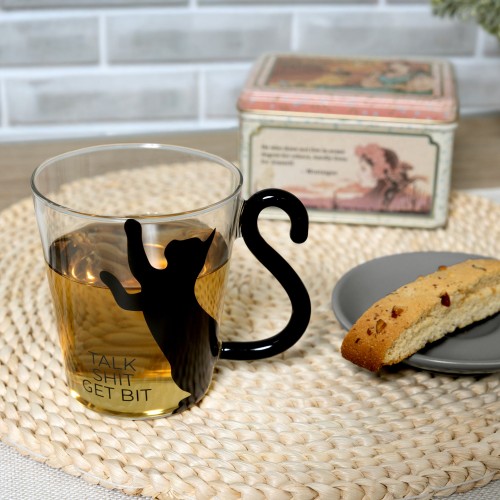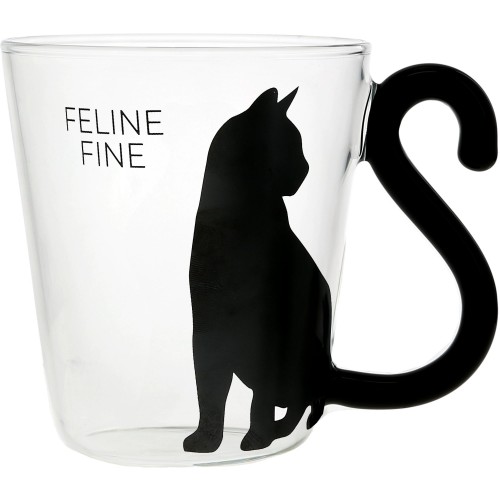 - PREMIUM QUALITY: This 13.5 oz glass cup features a clear glass body with a bold black cat decal mid-pounce, paired with a tail-shaped handle that adds playful design and easy grip. Dishwasher safe for convenience but best preserved with hand washing. Comes securely packaged in a white die-cut box—perfect for gifting to anyone with a mischievous sense of humor.
