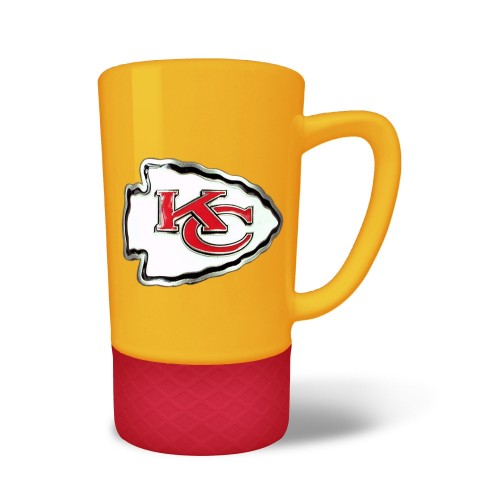 The 18 oz. JUMP team color ceramic coffee mug features a silicone base in coordinating team color and a hand crafted metal emblem.