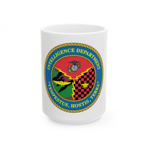 This coffee mug features a design centered around the “Intelligence Department” of the United States Marine Corps (USMC). The primary visual elements likely include the USMC emblem, potentially alongside a stylized representation of the Intelligence Department’s role within the Marines.