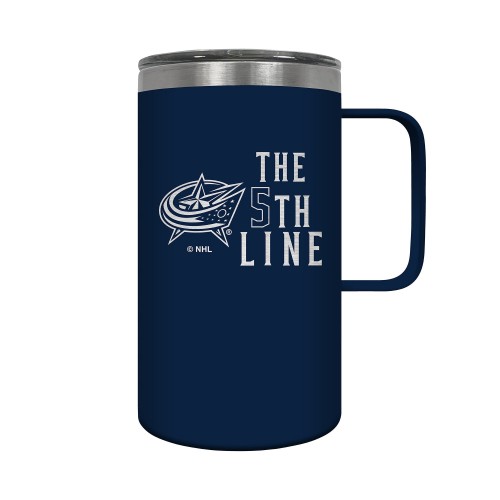 The Hustle is a 18oz vacuum insulated travel mug with large handle. Includes spill resistant lid and features laser etched team graphics.