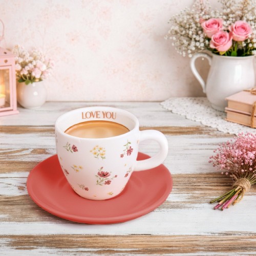 - IN-HOUSE DESIGN: Features soft pink and coral floral artwork with an embossed glossy sentiment reading “Love You.” The rose-colored saucer adds warmth, charm, and a coordinated boutique feel.