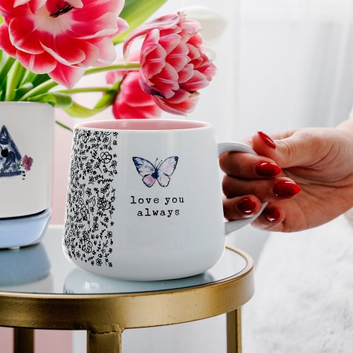 - IN-HOUSE DESIGN: You will see a typewriter written a “Love You Always” sentiment accompanied by a pink & purple butterfly design. A light pink glossy interior smooth-edged vessel with a glossy exterior with walls that features a black & white floral design that wraps around 3/4 the entire mug.