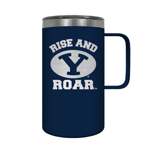 The Hustle is a 18oz vacuum insulated travel mug with large handle. Includes spill resistant lid and features laser etched team graphics.