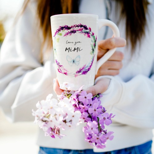 - IN-HOUSE DESIGN: Beautiful springtime patterns. Pink, purple, blue, & green floral wreath hugs a blue & black butterfly and a “Love you Mimi” sentiment in the center of the flower crown. The mug’s interior is blue, whereas the exterior is creamy white.