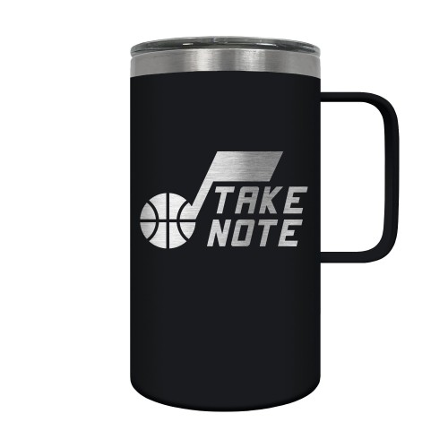 The Hustle is a 18oz vacuum insulated travel mug with large handle. Includes spill resistant lid and features laser etched team graphics.