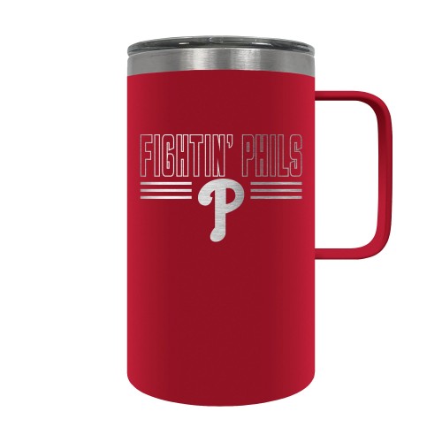 The Hustle is a 18oz vacuum insulated travel mug with large handle. Includes spill resistant lid and features laser etched team graphics.