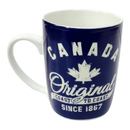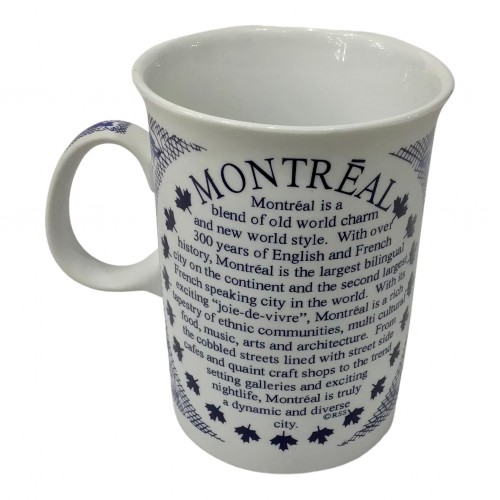 MUG MONTREAL SCENIC VINTAGE PRINT W/ HISTORY TEXT TEA CUP WHITE AND BLUE