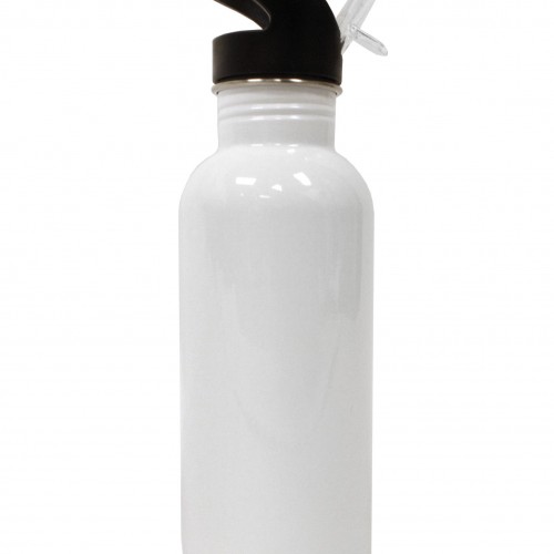 - 600ml white coated aluminum water bottle with screw-on cap, carabeener, and suckle cap with attached cover. Print on one side. May also be the style pictured in the secondary image (no-spill fold-out straw spout)