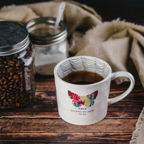 - IN-HOUSE DESIGN: “Nana You Mean The World To Me” text and debossed color splash butterfly detail are applied to the exterior of the mug, while the interior features a stripe pattern.