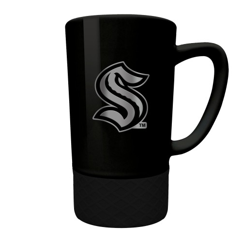 The 18 oz. STEALTH JUMP ceramic coffee mug features a black silicone base and a hand crafted metal team emblem.
