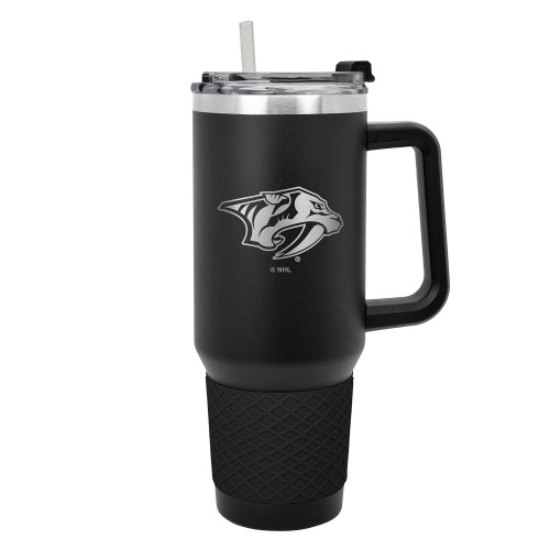 The 40 oz. Stealth COLOSSUS travel mug is made of high quality vacuum insulated stainless steel and comes with a silicone grip. It features a high quality laser etched officially licensed team logo. Includes a push down lid and clear drinking straw.