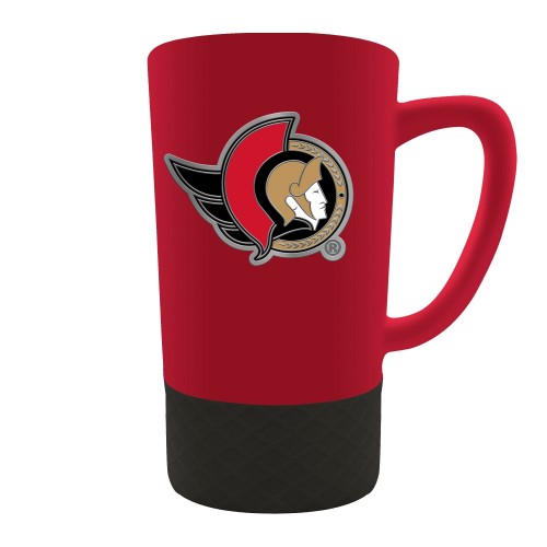 The 18 oz. JUMP team color ceramic coffee mug features a silicone base in coordinating team color and a hand crafted metal emblem.