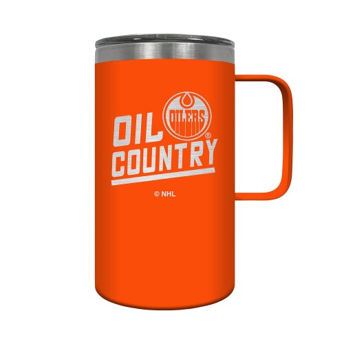 The Hustle is a 18oz vacuum insulated travel mug with large handle. Includes spill resistant lid and features laser etched team graphics.