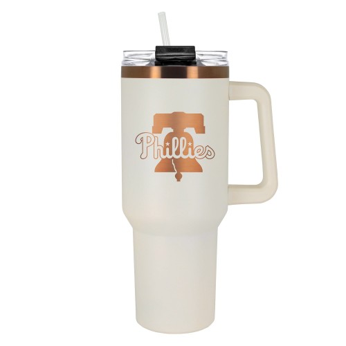 This 40 oz. COLOSSUS travel mug is made of high quality vacuum insulated stainless steel. It features premium copper undertones with durable powder coated cream outer finishe and laser etched team graphics.