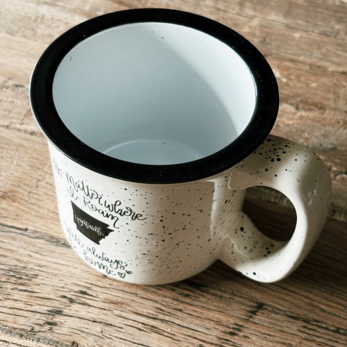 Sip your coffee with a side of hometown pride in the “No Matter Where I Roam Fayetteville Will Always Be Home” Camper Mug! This 13oz mug features a heartwarming reminder that no matter where life takes you, Fayetteville will always be your place to call home. With speckles and a unique rim, each mug is one of a kind! For best care, hand wash only and cherish your favorite drink in style.