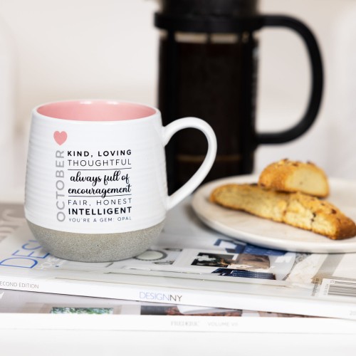 - IN-HOUSE DESIGN: The coffee cup features a glossy Silver “October” sentiment that lines the left side under the pink heart accompanied by a glossy black “Kind, Loyal, Trustworthy, So Clever And Knowledgeable, Careful, Organized, Confident, You Are A Gem: Sapphire” wording to the right, which is centered on the front side of the cup.