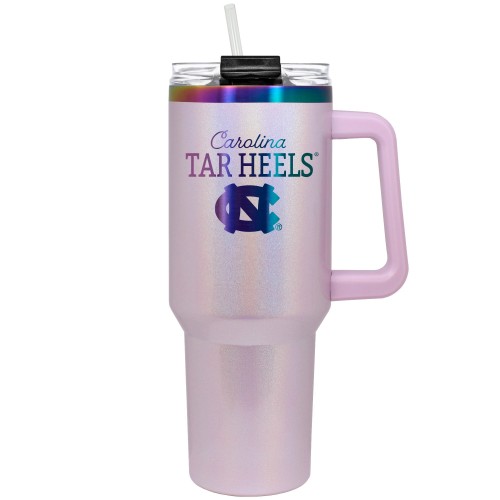 This 40 oz. COLOSSUS travel mug is made of high quality vacuum insulated stainless steel. It features premium multi-color radiance undertones with durable powder coated pink sparkle finish and laser etched team graphics.