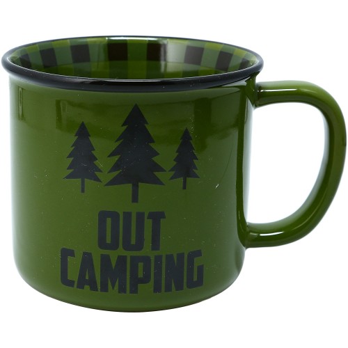 - IN-HOUSE DESIGN: The earthy beige coffee cup features an “Out Hiking” one-sided design accompanied by an interior plaid wrap-around pattern and a mountain scene decal.