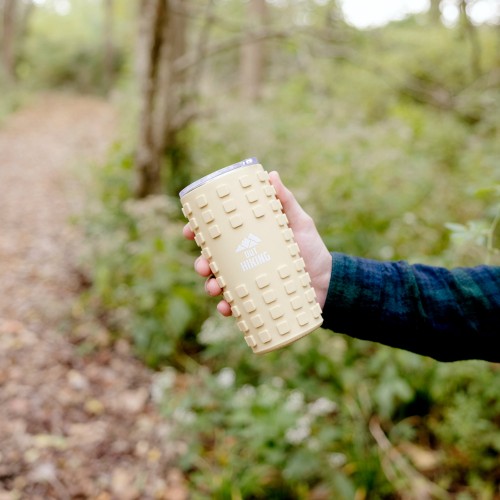 - IN-HOUSE DESIGN: The earthy beige coffee cup features an “Out Hiking” one-sided design accompanied by a white mountain range decal.