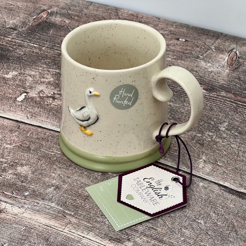 These sweet mugs have a blue heart design on one side and blue spots on the inside.