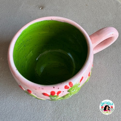This mug is hand painted by me (Kathy, The Crafty Chica), and it is painted inside and out. It has at least eight different colors applied.
