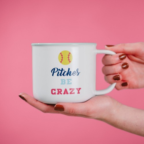 - IN-HOUSE DESIGN: Glossy “Pitches Be Crazy” text and softball image are both heat-printed onto the front of the mug.