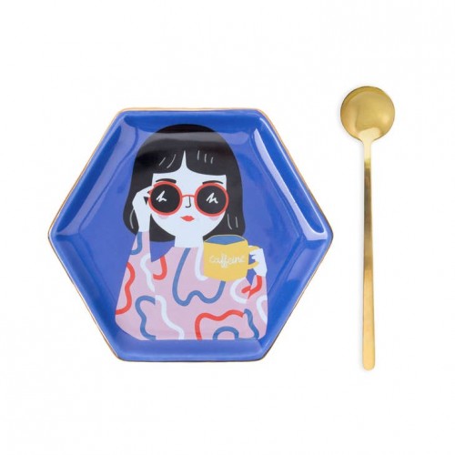 The cup is hexagonal and tall. It also includes a golden metal spoon. Both on the cup and on the tray, they have a design of a girl drinking coffee.