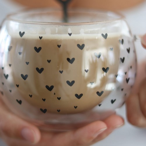 This glass mug features a black multi heart design and a 400ml capacity, making it a comfortable large mug for everyday use. Designed as a double walled glass mug, it works well as an insulated mug for hot drinks while remaining easy to hold. A functional but decorative option, it fits naturally into your kitchen decor and works just as well in daily use as it does left out on display.