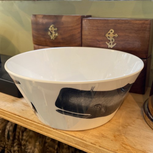 This dishwasher safe melamine bowl measures 6.5 inches deep and 2.75 inches high. Nautically themed with a whale, anchor and ship featured on each. Perfect for snacks alfresco or at the beach.