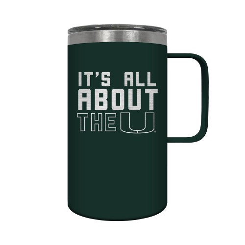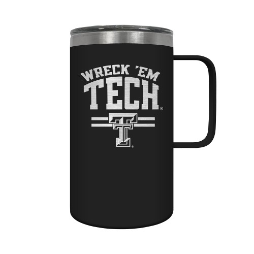The Hustle is a 18oz vacuum insulated travel mug with large handle. Includes spill resistant lid and features laser etched team graphics.